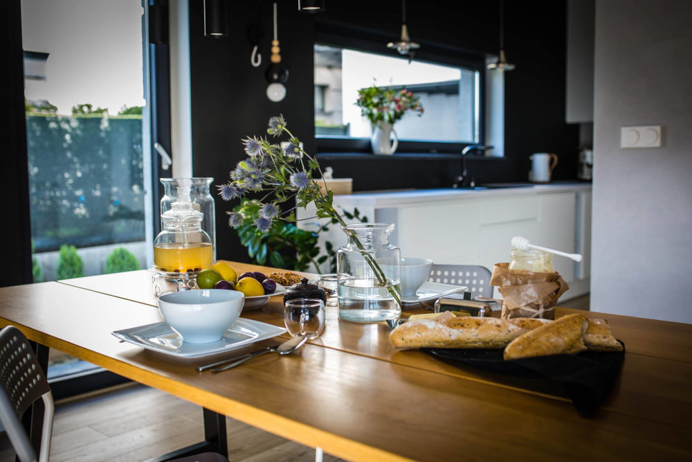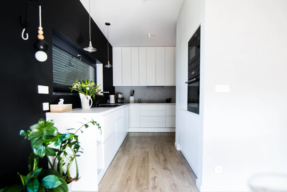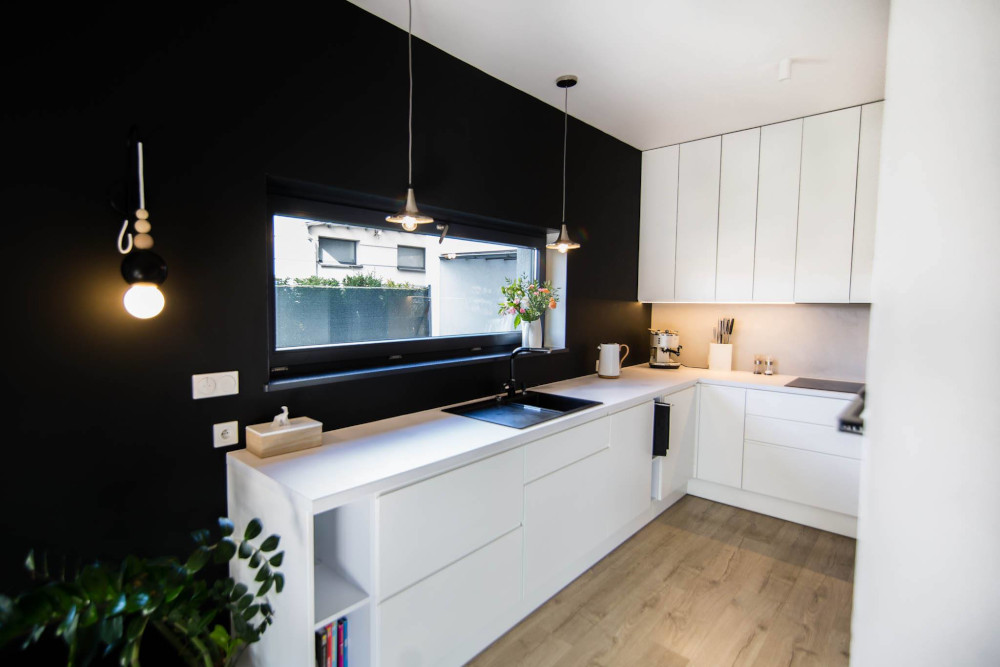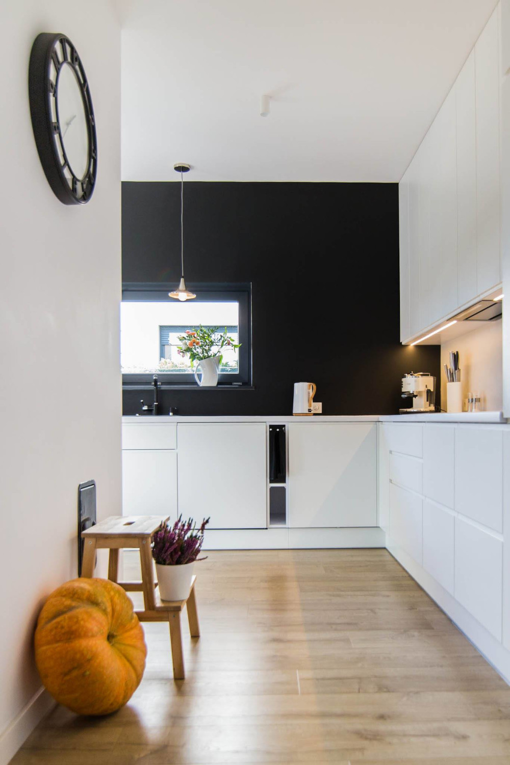 Prostota z twistem – to co lubimy najbardziej. Tak biała kuchnia została pięknie podkręcona czarną ścianą. Ciekawym rozwiązaniem jest odrębny schowek na kuchenne ręczniki, ponieważ zazwyczaj zostaje to pominięte na etapie projektu, a późniejsza kuchenna rzeczywistość mocno odbiega od tej początkowej.