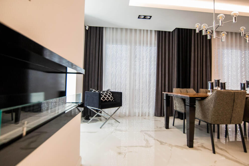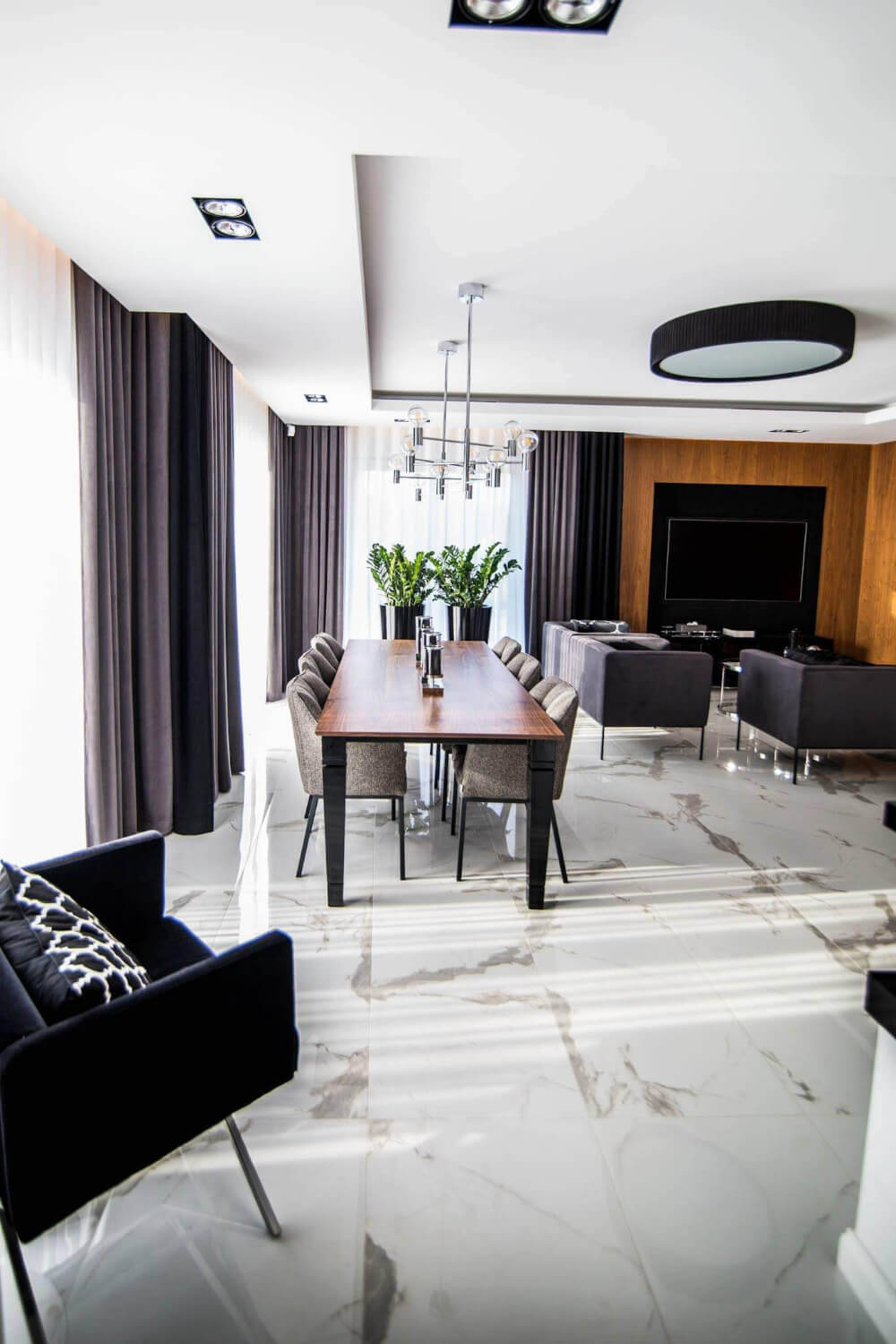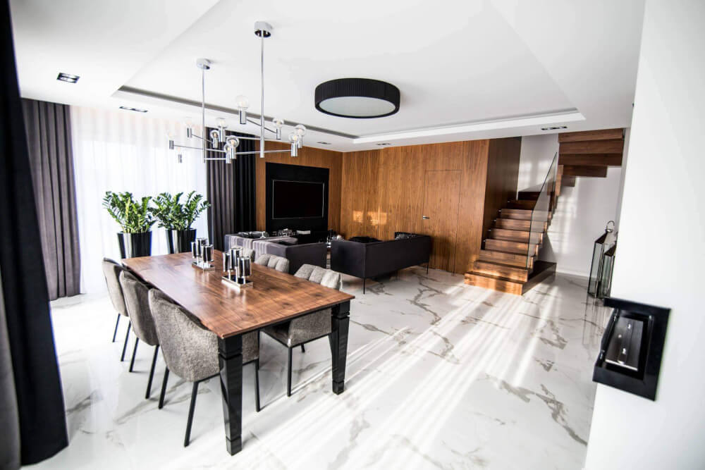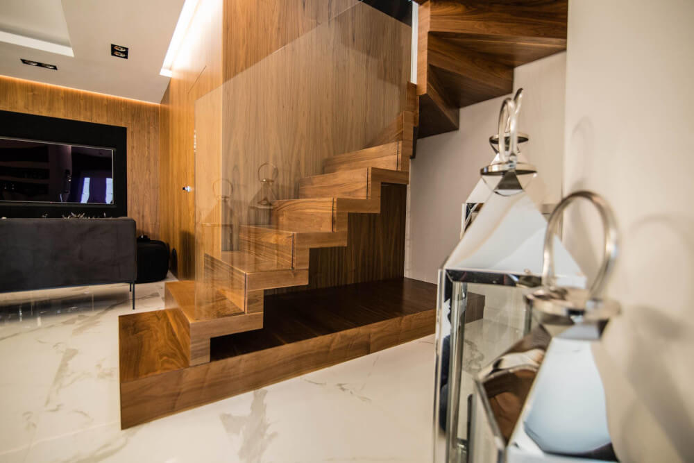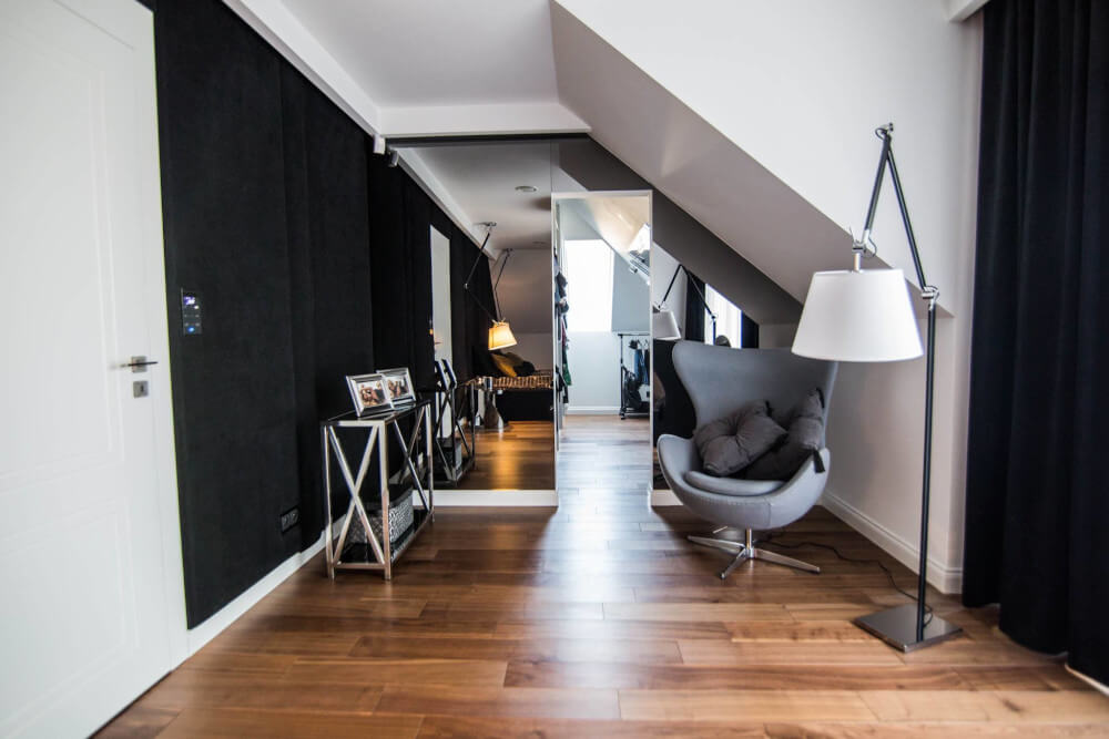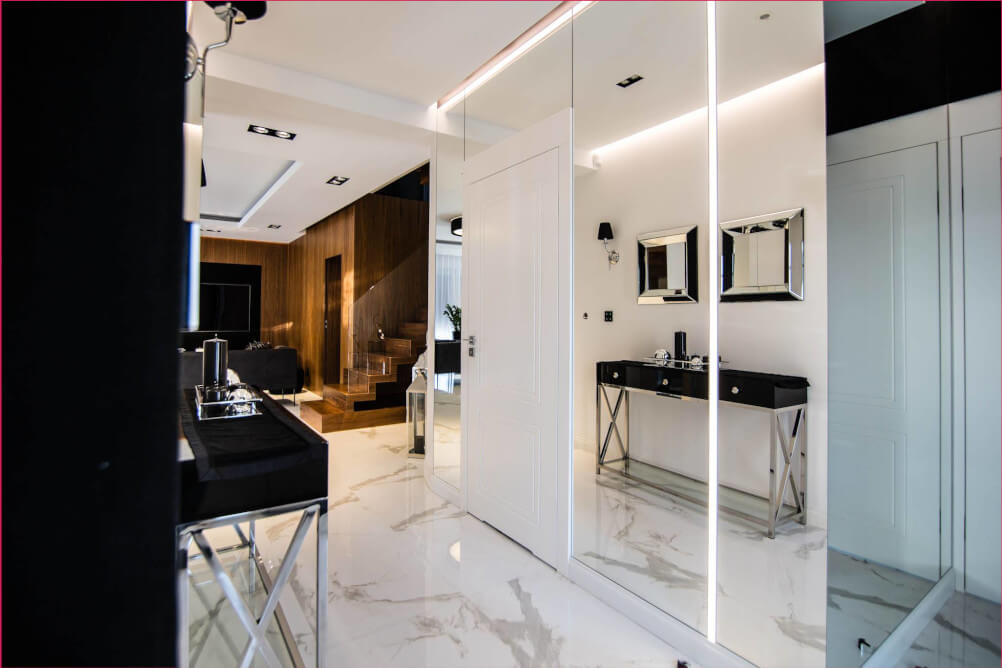 Dom w stylu klasycznym. Inwestorzy życzyli sobie aby całość stanowiło połączenie czerni, bieli i srebra. Piękny odcień drewna ociepla wnętrze. Mamy tu ścianę pokrytą fornirem z ukrytymi drzwiami do pokoju gier. Ogromne lustra i tapicerowana ściana w przedpokoju dodają elegancji i przestrzeni.