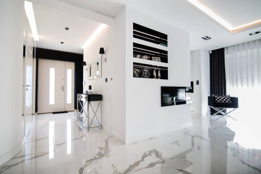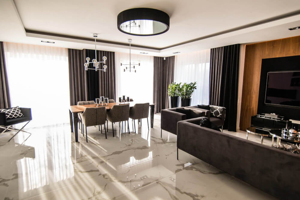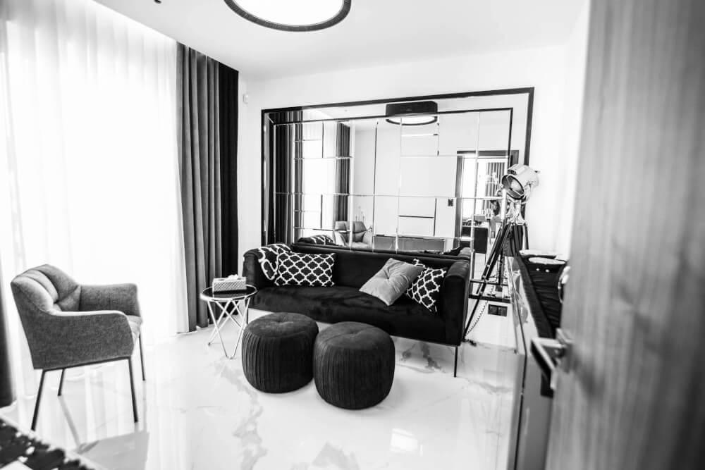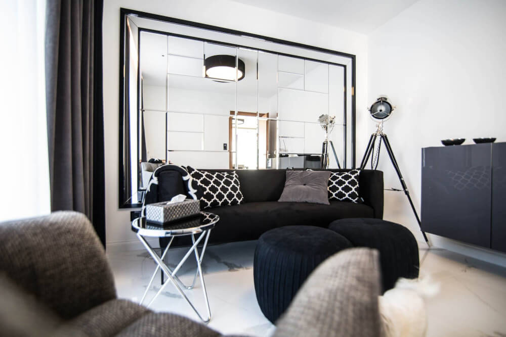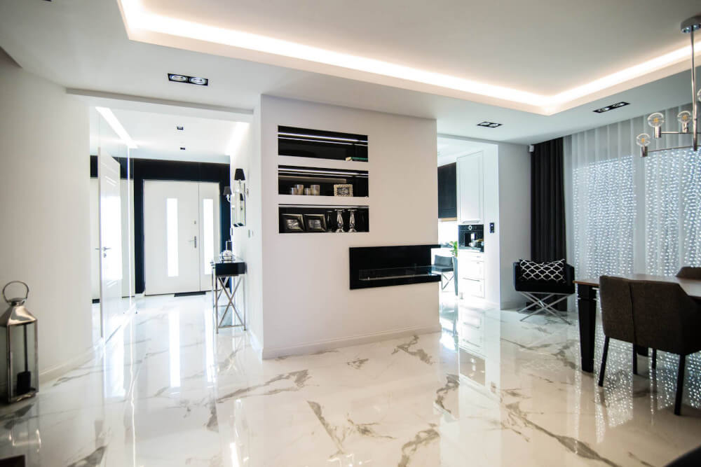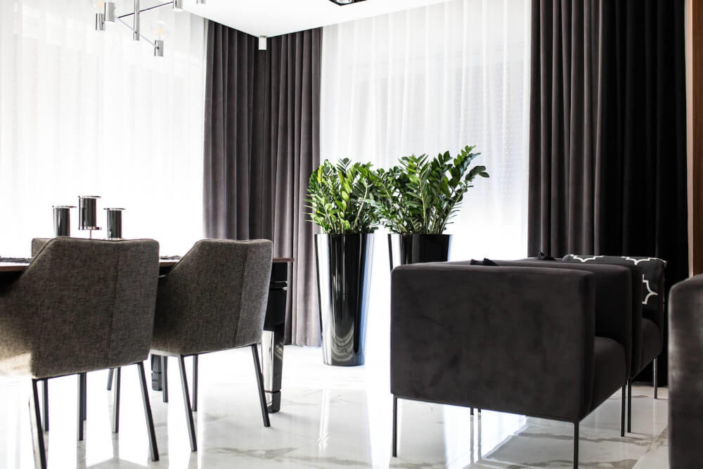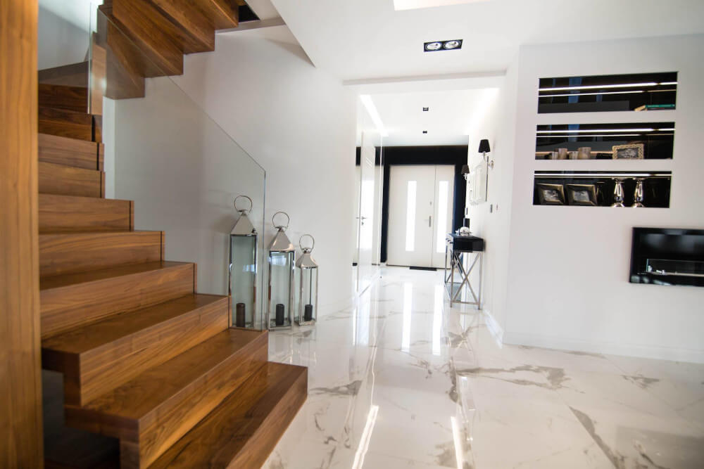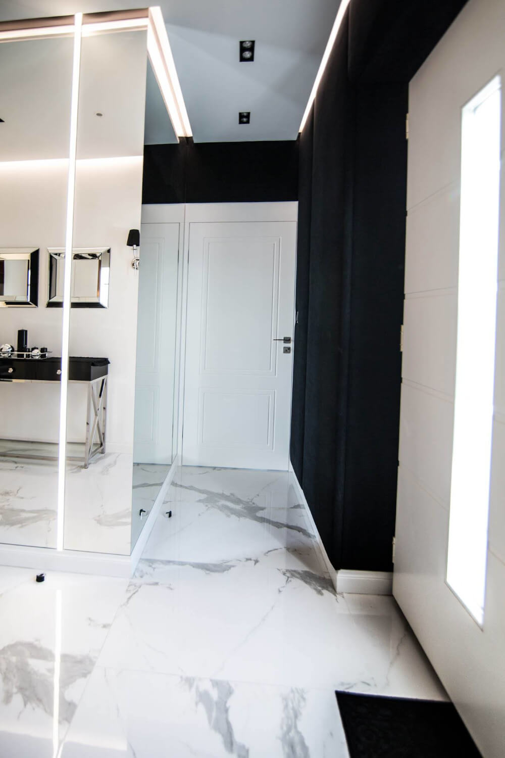 Dom w stylu klasycznym. Inwestorzy życzyli sobie aby całość stanowiło połączenie czerni, bieli i srebra. Piękny odcień drewna ociepla wnętrze. Mamy tu ścianę pokrytą fornirem z ukrytymi drzwiami do pokoju gier. Ogromne lustra i tapicerowana ściana w przedpokoju dodają elegancji i przestrzeni.