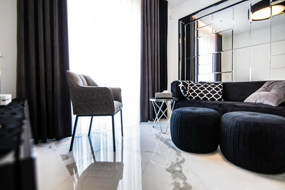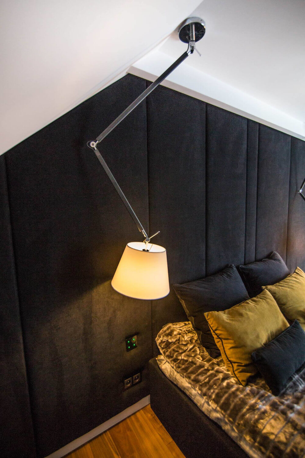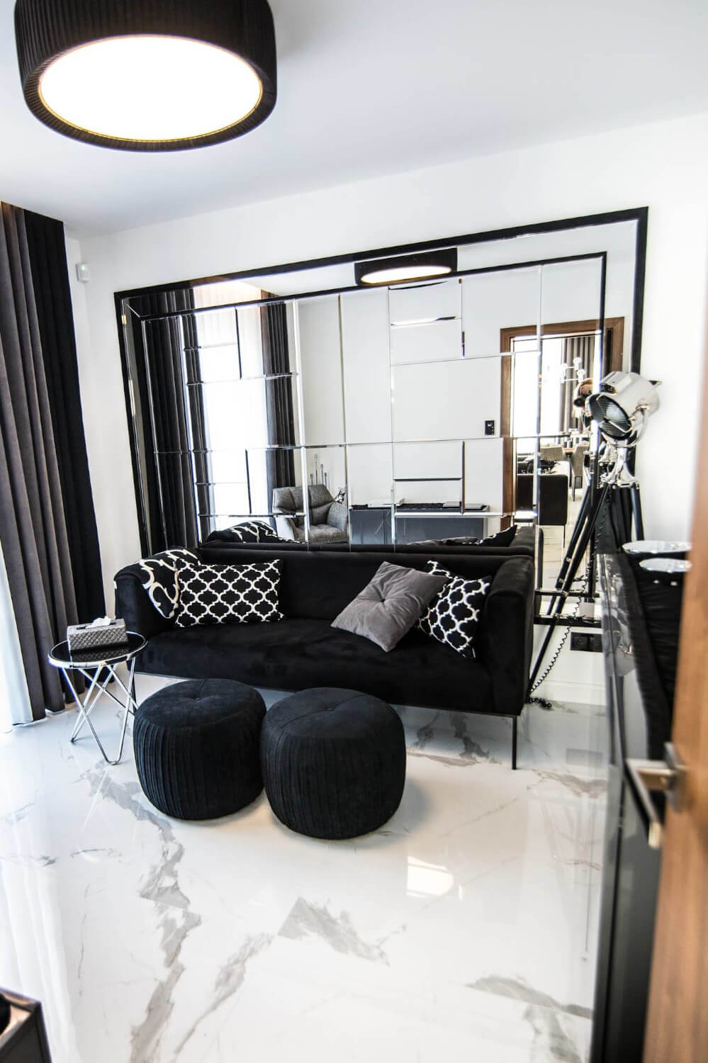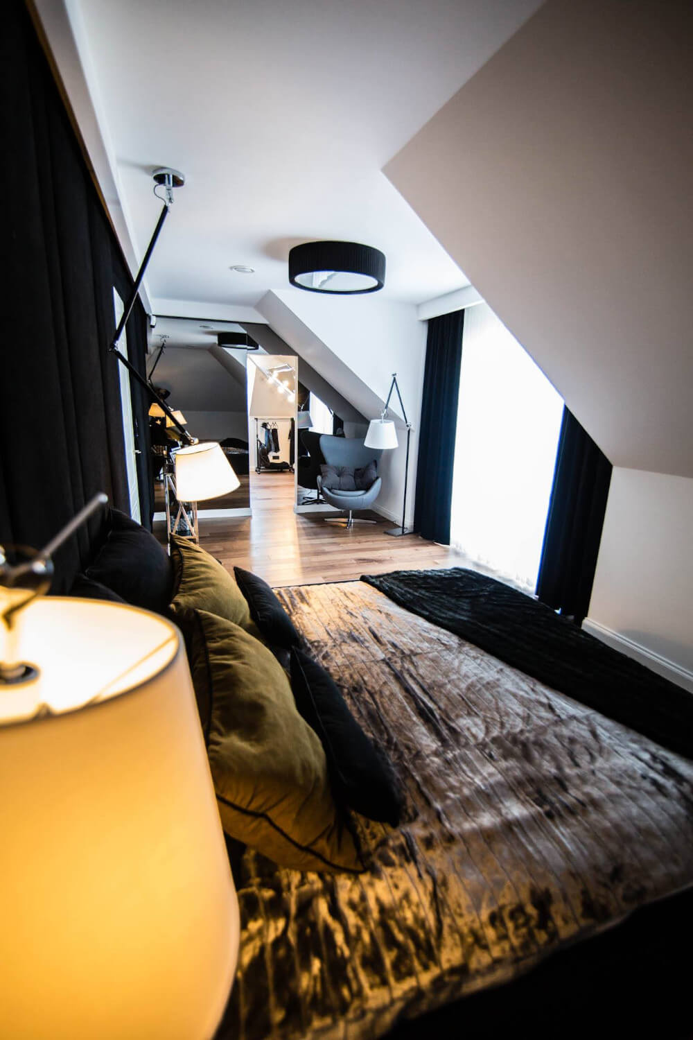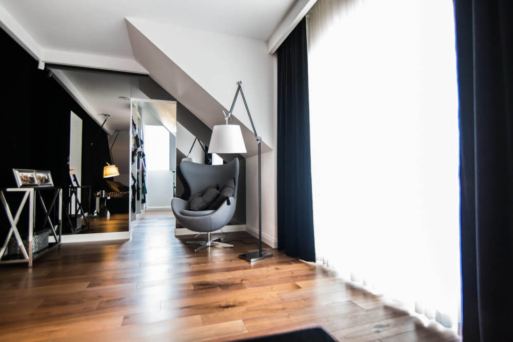 Dom w stylu klasycznym. Inwestorzy życzyli sobie aby całość stanowiło połączenie czerni, bieli i srebra. Piękny odcień drewna ociepla wnętrze. Mamy tu ścianę pokrytą fornirem z ukrytymi drzwiami do pokoju gier. Ogromne lustra i tapicerowana ściana w przedpokoju dodają elegancji i przestrzeni.