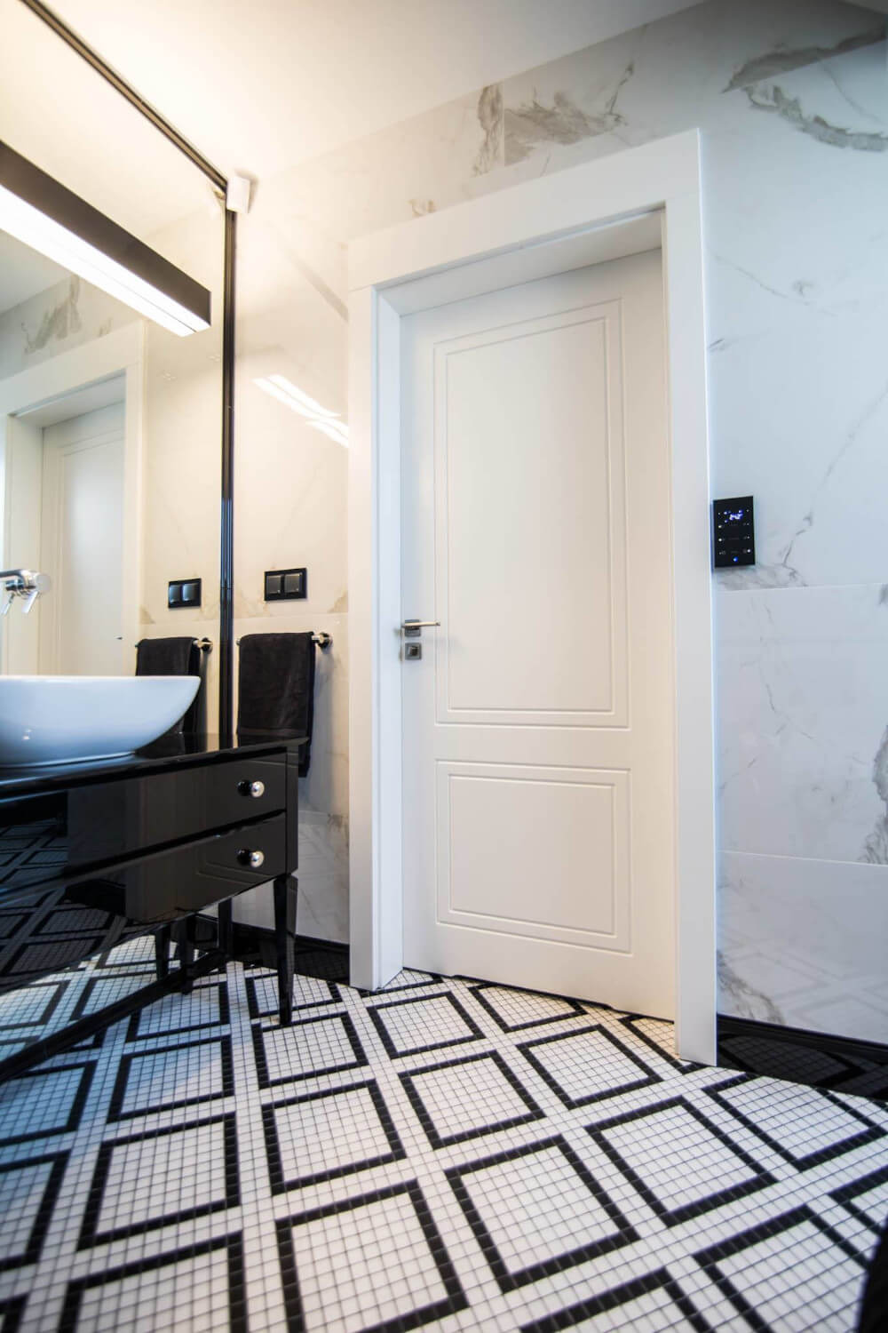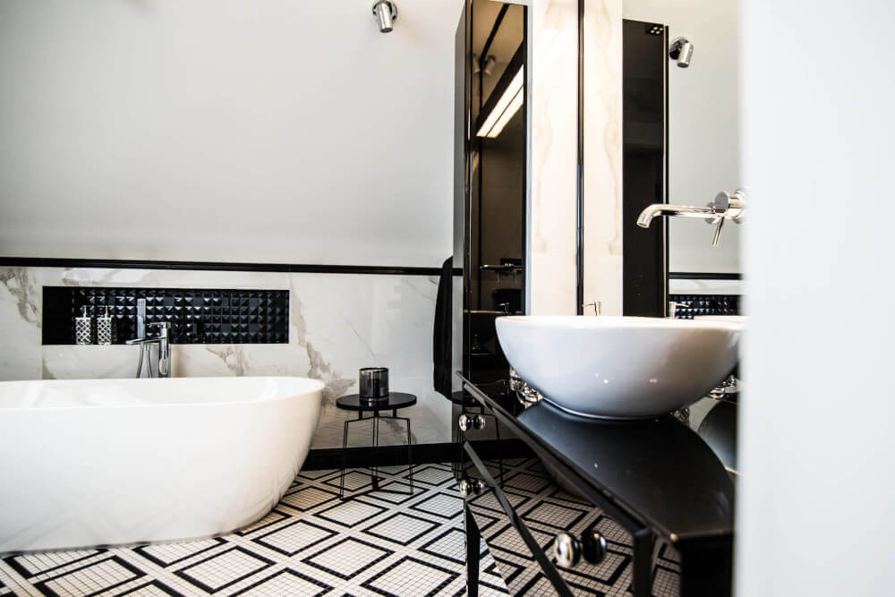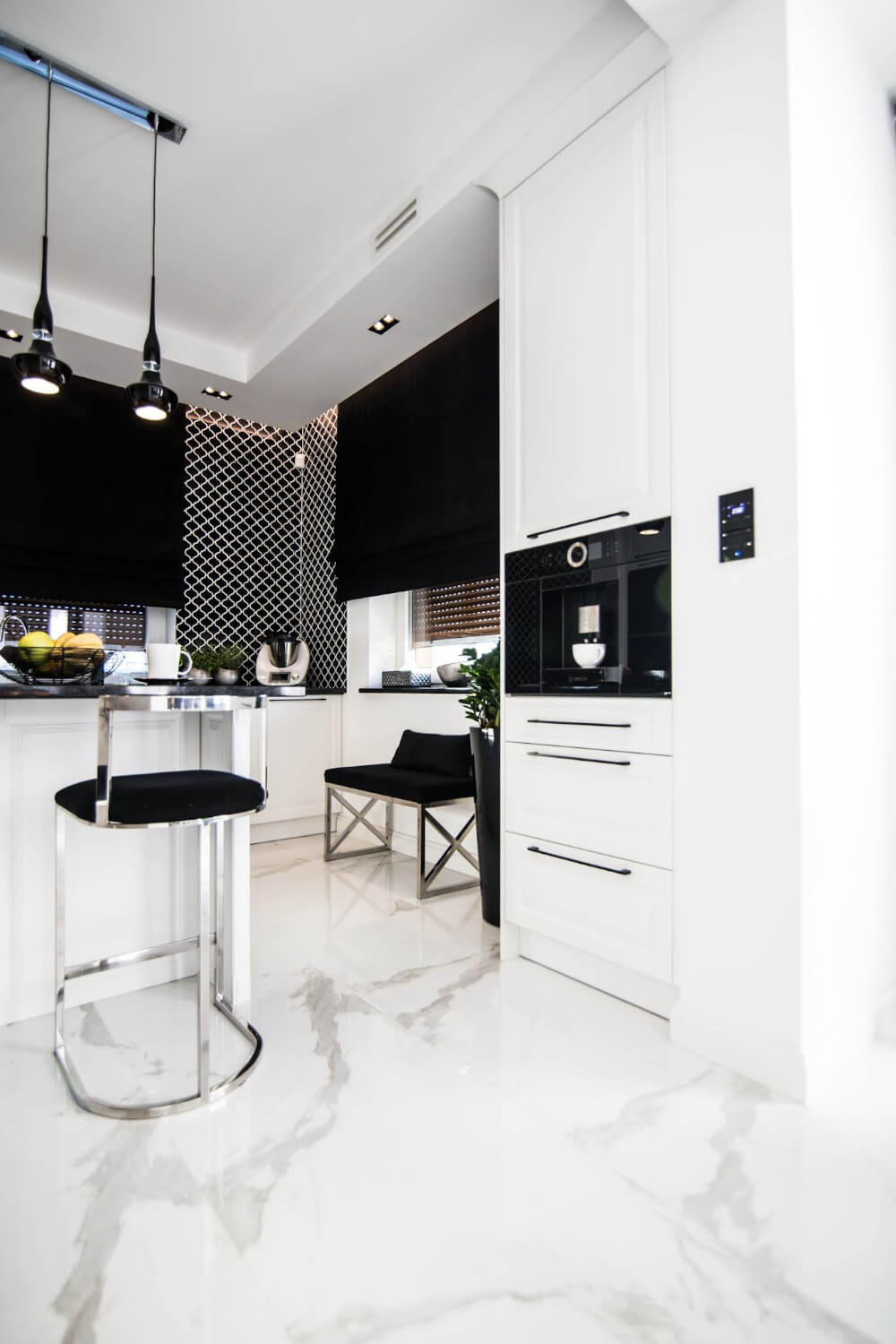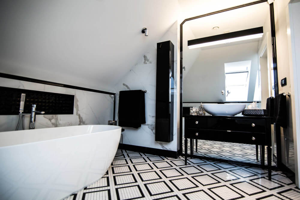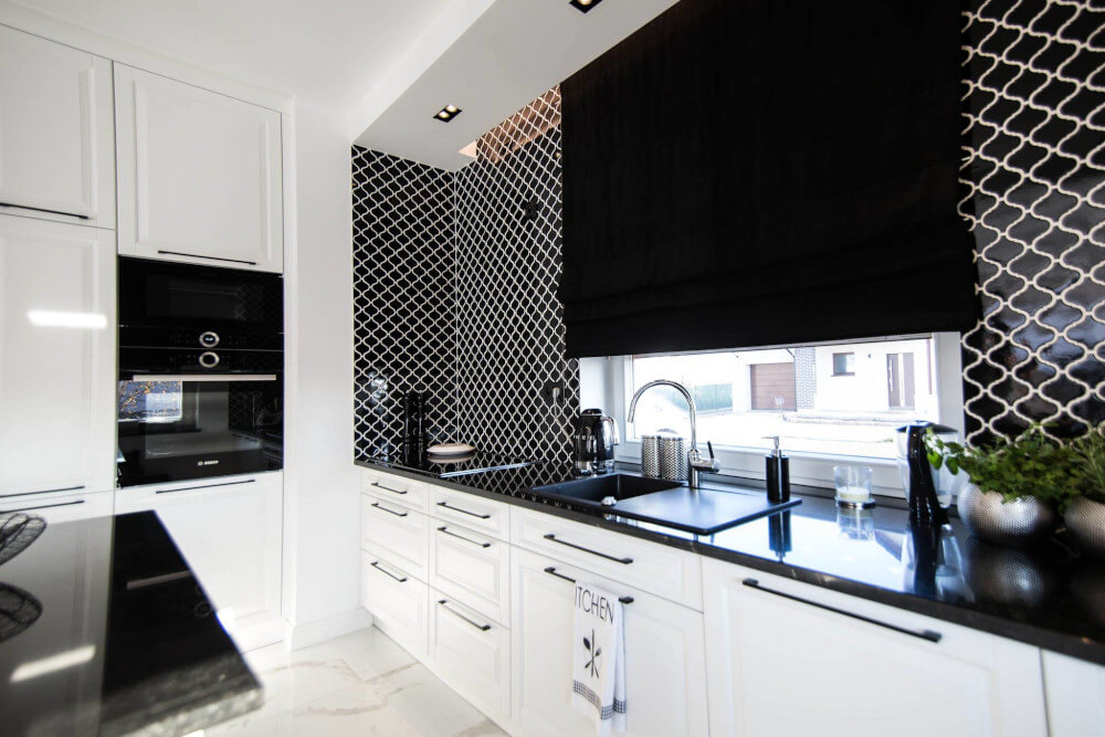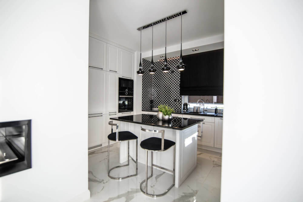 Kuchnia to ukłon w stronę klasyki black & white z piękną mozaiką na ścianie. Klienci chcieli aby w kuchni zmieściła się wyspa. Zabudowa skrywa dwie lodówki, co pojemnościowo daje więcej miejsca niż jedna z podwójnymi drzwiami, a wizualnie nie zaburza przestrzeni, ponieważ pozostaje w zabudowie jednolitymi frontami. Duża łazienka utrzymana jest w spójnej stylistyce całego domu.