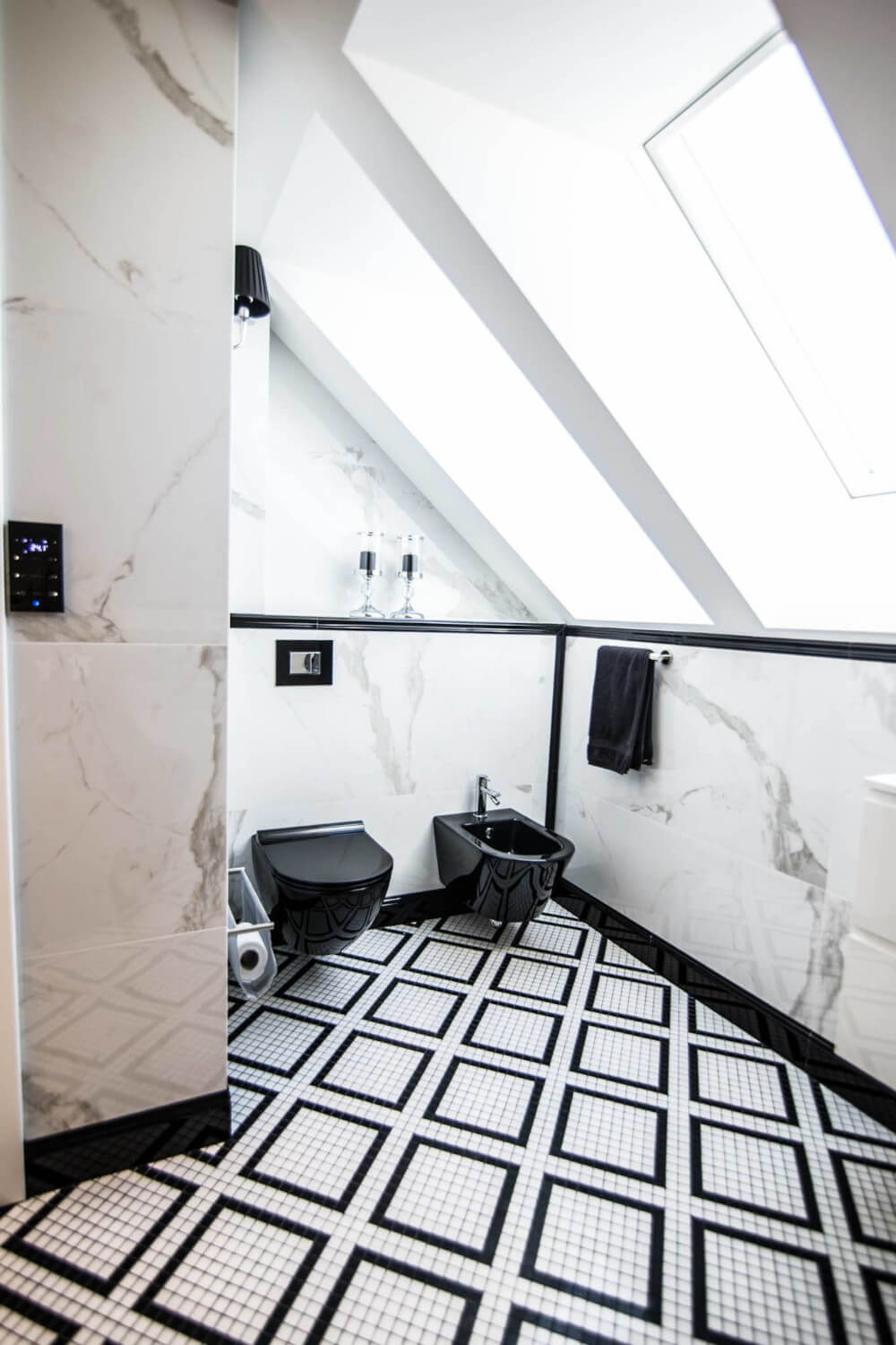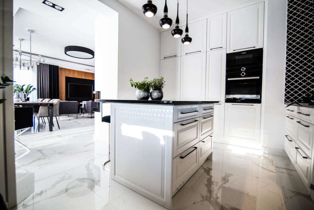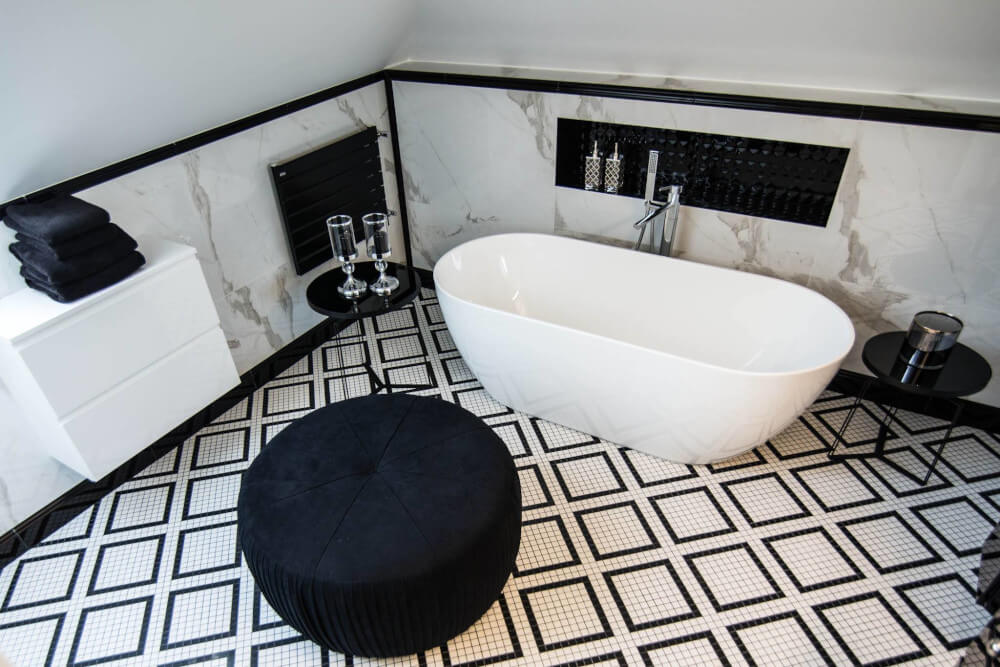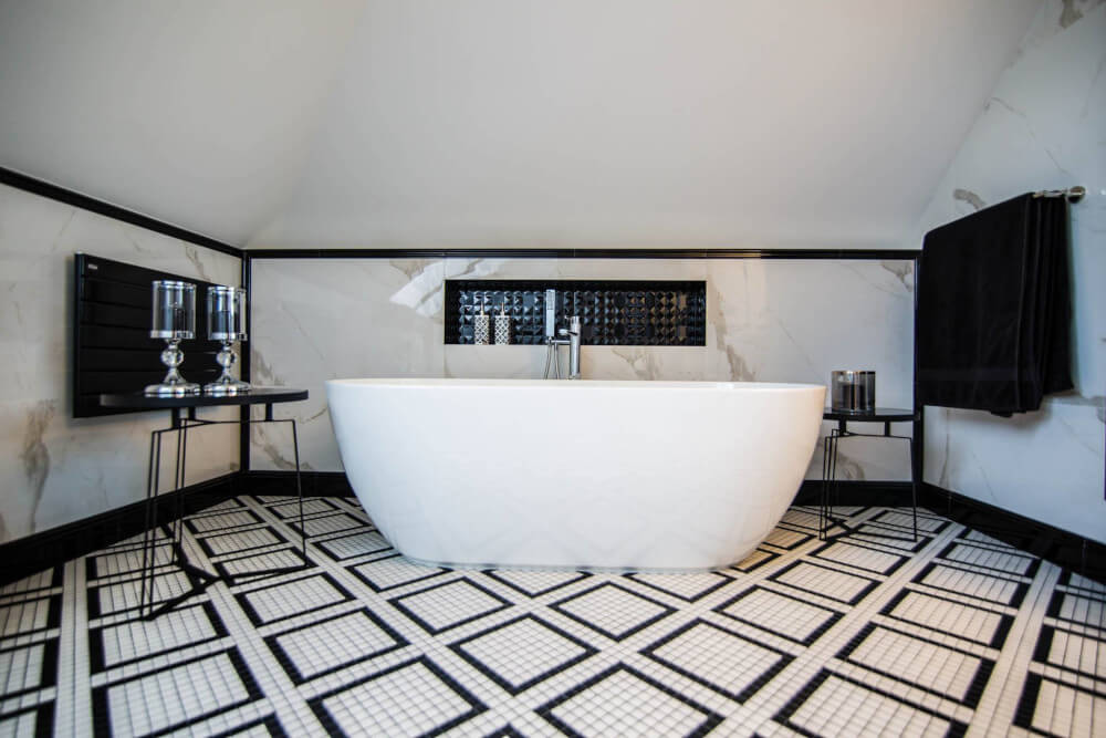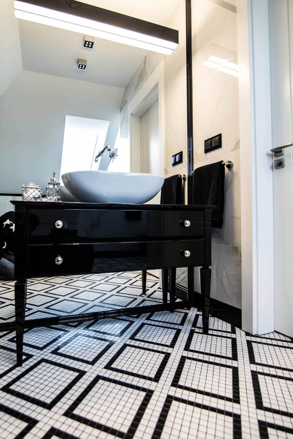 Kuchnia to ukłon w stronę klasyki black & white z piękną mozaiką na ścianie. Klienci chcieli aby w kuchni zmieściła się wyspa. Zabudowa skrywa dwie lodówki, co pojemnościowo daje więcej miejsca niż jedna z podwójnymi drzwiami, a wizualnie nie zaburza przestrzeni, ponieważ pozostaje w zabudowie jednolitymi frontami. Duża łazienka utrzymana jest w spójnej stylistyce całego domu.
