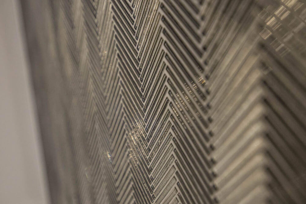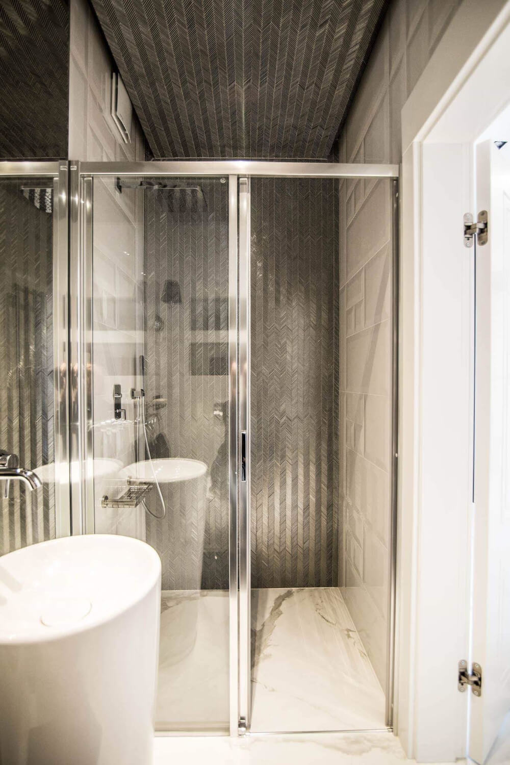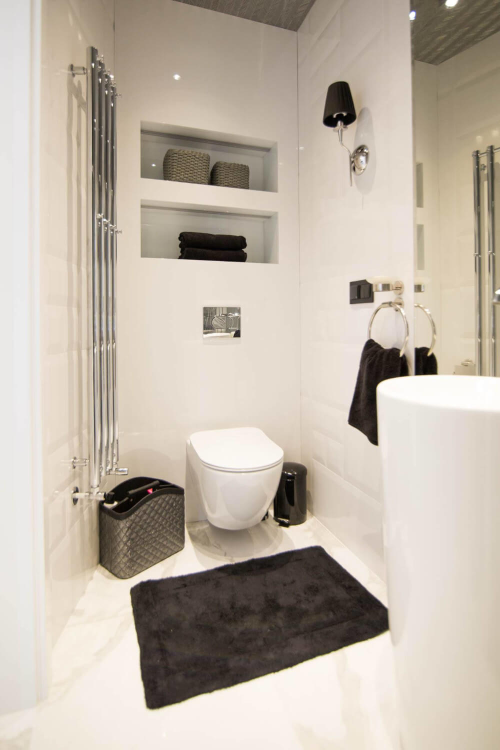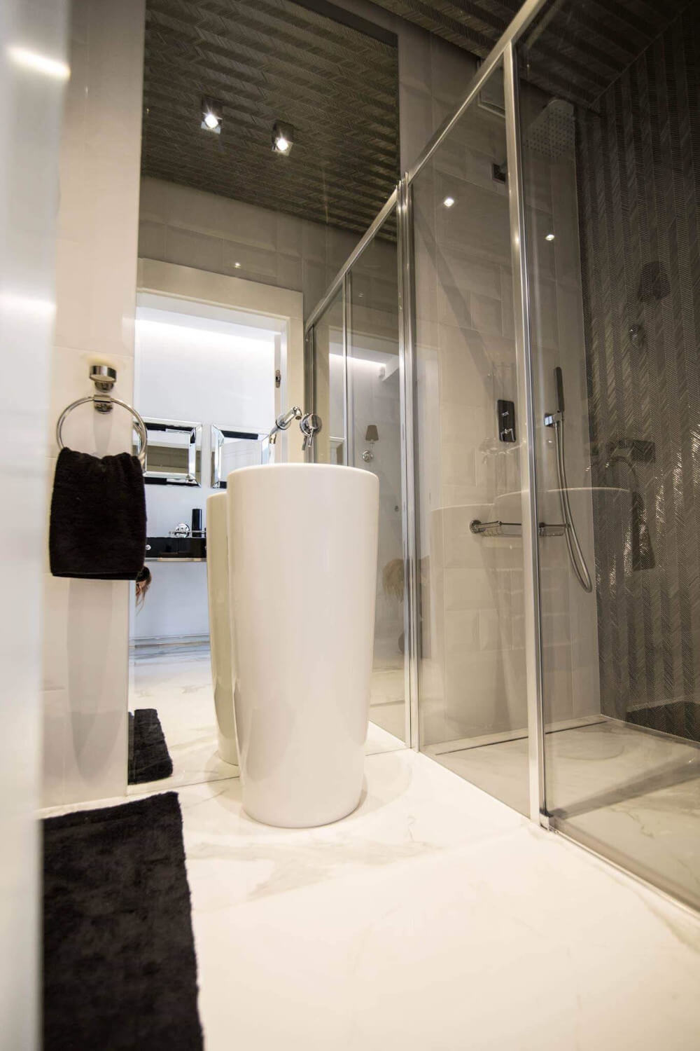 Kuchnia to ukłon w stronę klasyki black & white z piękną mozaiką na ścianie. Klienci chcieli aby w kuchni zmieściła się wyspa. Zabudowa skrywa dwie lodówki, co pojemnościowo daje więcej miejsca niż jedna z podwójnymi drzwiami, a wizualnie nie zaburza przestrzeni, ponieważ pozostaje w zabudowie jednolitymi frontami. Duża łazienka utrzymana jest w spójnej stylistyce całego domu.