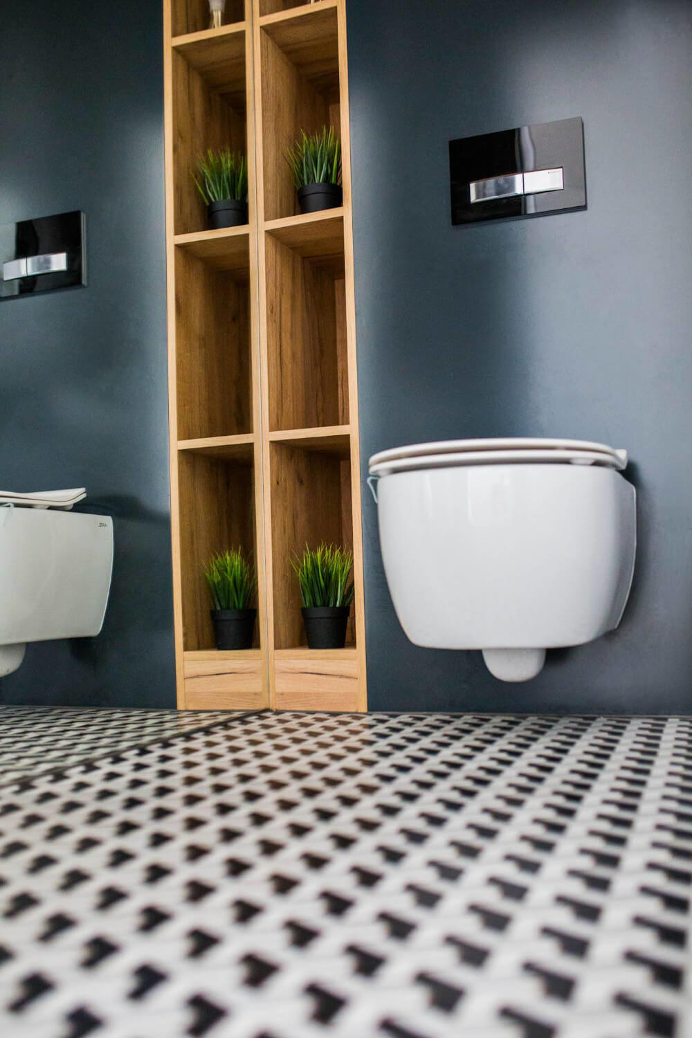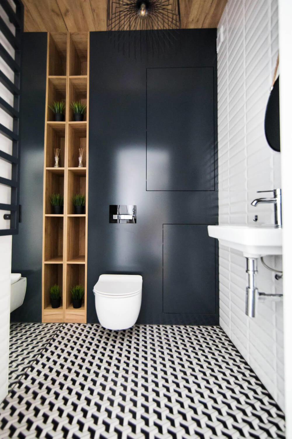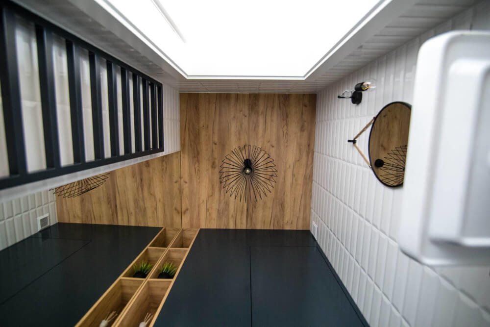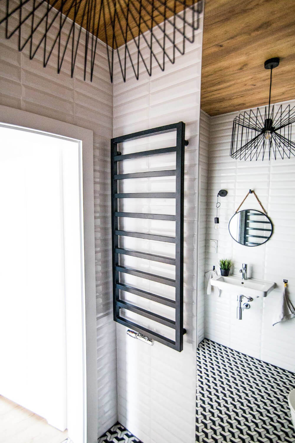 Mała łazienka dla gości z zabudową, która skrywa piec i daje miejsce na przechowywanie. Duże lustro w nietypowym miejscu daje piękne powiększenie całości, a drewno przeciągnięte na sufit sprawia, że wnętrze jest przytulniejsze.